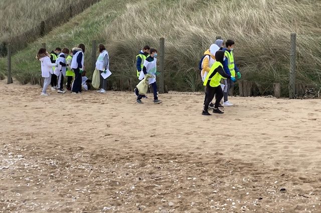 Les élèves ont collecté des détritus, matériaux, cartons usagés, objets pour créer un outil pour peindre. Le ramassage a été fait sous forme de course d’orientation.